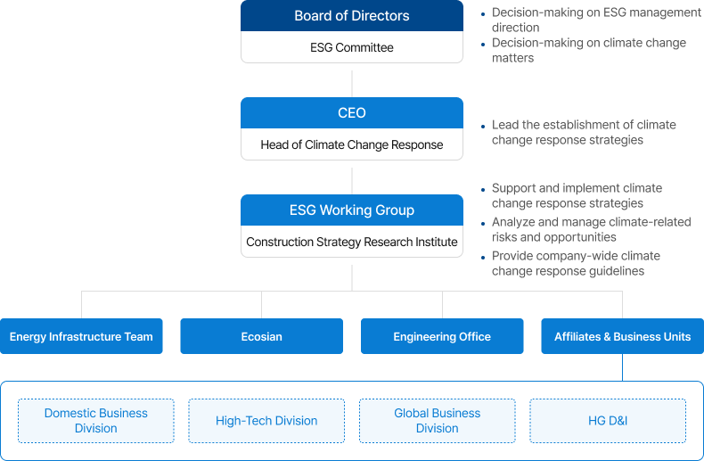 Since 2021, the CEO has been appointed as a member of the ESG Committee, leading the implementation of climate strategies across the company. The CEO and senior executives share climate policy trends, corporate strategies from domestic and international companies, and the company’s environmental innovation initiatives through the “CEO’s Corner,” strengthening communication both internally and externally. The Construction Strategy Research Institute, as the lead organization, collaborates closely with affiliated business units and subsidiaries in the ESG Working Group to drive climate change strategies forward.