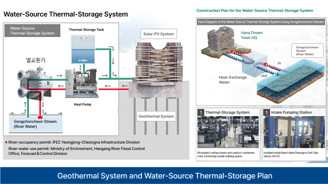 Designed by NBBJ, Gansam, and Kunwon and managed by HanmiGlobal, the Hana Dream Town Group HQ is a flagship green project. The 128,474 m² building will serve as Hana Bank’s new headquarters and prioritizes reducing electricity use and CO₂ emissions by integrating rooftop solar PV and geothermal energy. The roof carries 1,236 m² of solar panels, and eight closed-loop geothermal systems are being installed. At the construction stage, the project has already secured Korea Green Building preliminary certification, Grade 1 (Excellent).
