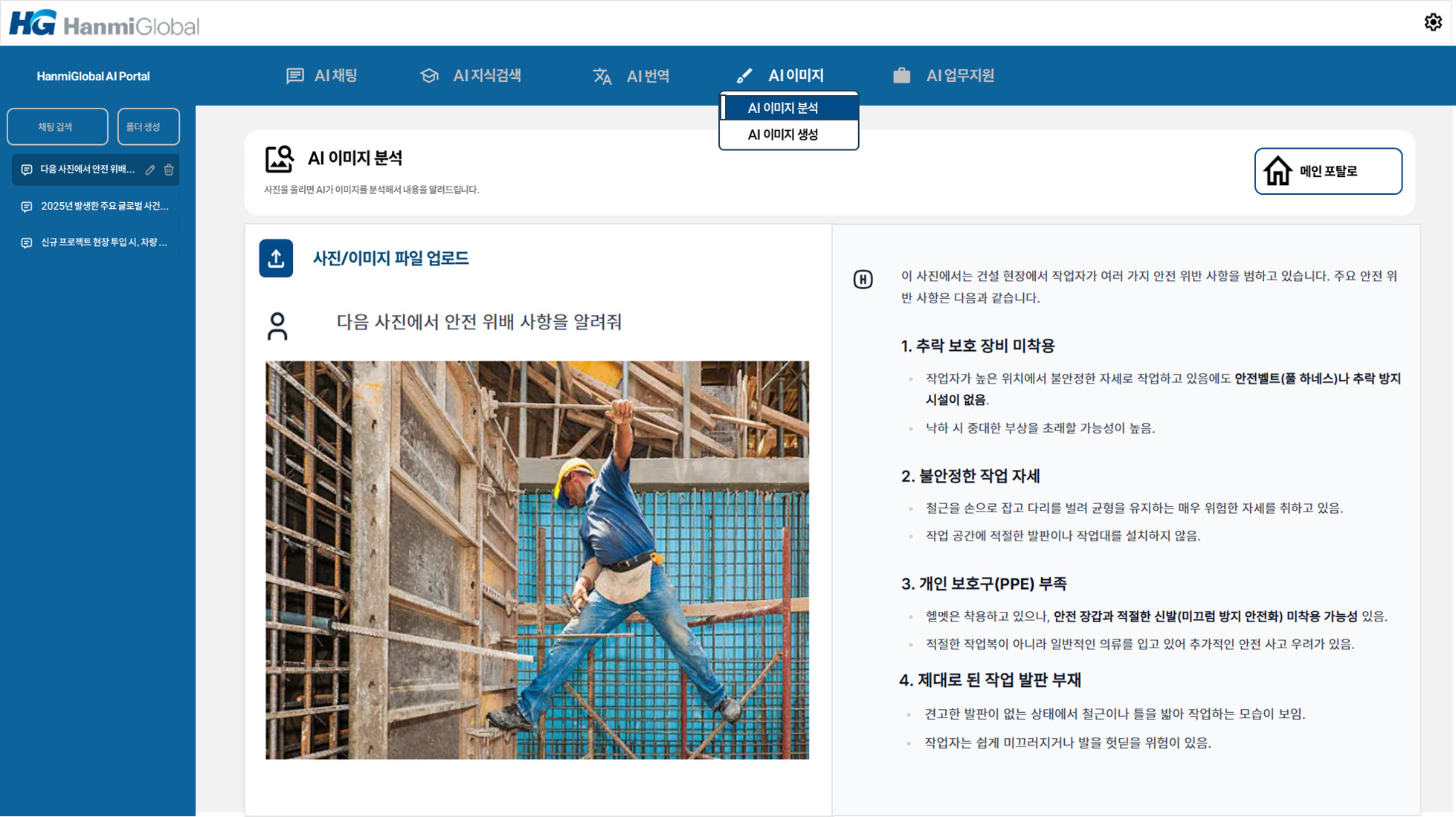 When users upload an image (e.g., a job site photo), the AI automatically recognizes the content and delivers an analytical report.
