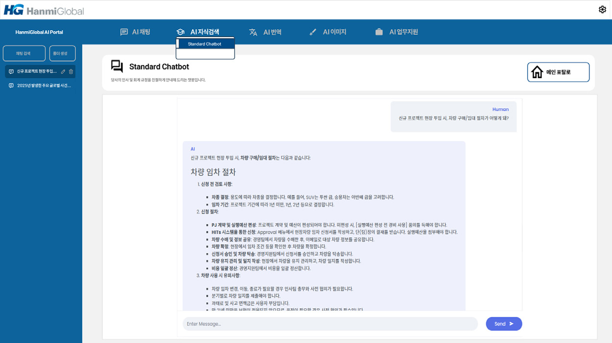 The HG AI Portal is HanmiGlobal’s proprietary generative AI platform that consolidates multiple AI functions on a single page. It builds on the original HanmiGPT service and adds AI knowledge search and task support features, enabling fast information retrieval and higher work productivity for all employees.