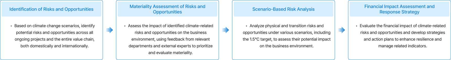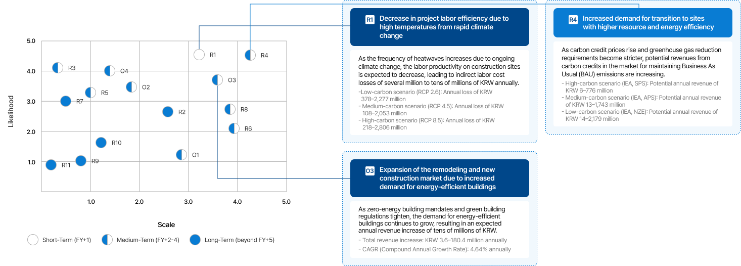 HanmiGlobal has identified both short-term and long-term risks and opportunities related to climate change across the entire value chain. These issues have been grouped into an issue pool, and through materiality assessments, 15 key issues were identified that require action. These include reduced labor efficiency due to the impacts of rapid climate change on projects, increased costs related to decarbonization efforts as demand rises for energy-efficient and resource-conserving workplaces, and the need to expand R&D efforts in response to growing market demand for energy-efficient buildings. The identified issues were evaluated in terms of their potential financial impact on the company, as well as the likelihood and magnitude of their occurrence.