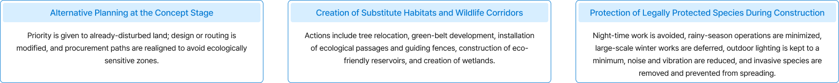 From the planning stage onward, HanmiGlobal proactively analyzes potential ecological impacts on each site and its surroundings, then reviews design options and construction methods that help preserve local habitats and species diversity. Through formal environmental impact assessments, the Company identifies endangered species, natural monuments, and other protected flora and fauna near the project area, and implements measures such as habitat conservation or creation of substitute habitats.