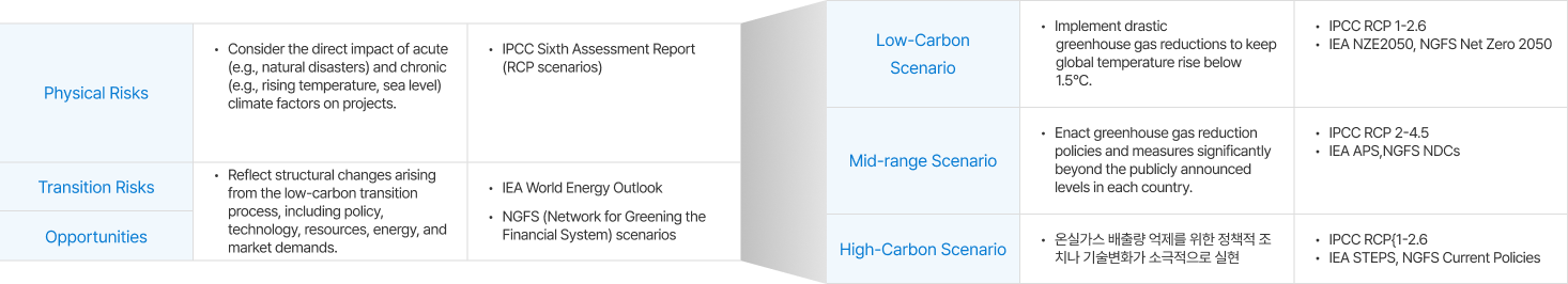 HanmiGlobal identifies physical and transition risks and opportunities arising from climate change by analyzing the potential changes in the business environment. Using the IPCC RCP scenarios and the IEA and NGFS base scenarios, we assess the impacts of low-carbon, intermediate, and high-carbon scenarios. This allows us to evaluate potential policies, technology, market changes, and the likelihood of natural disasters, helping us formulate a response strategy. We also set sector-specific reduction targets and implementation plans to strengthen the foundation for sustainable growth.