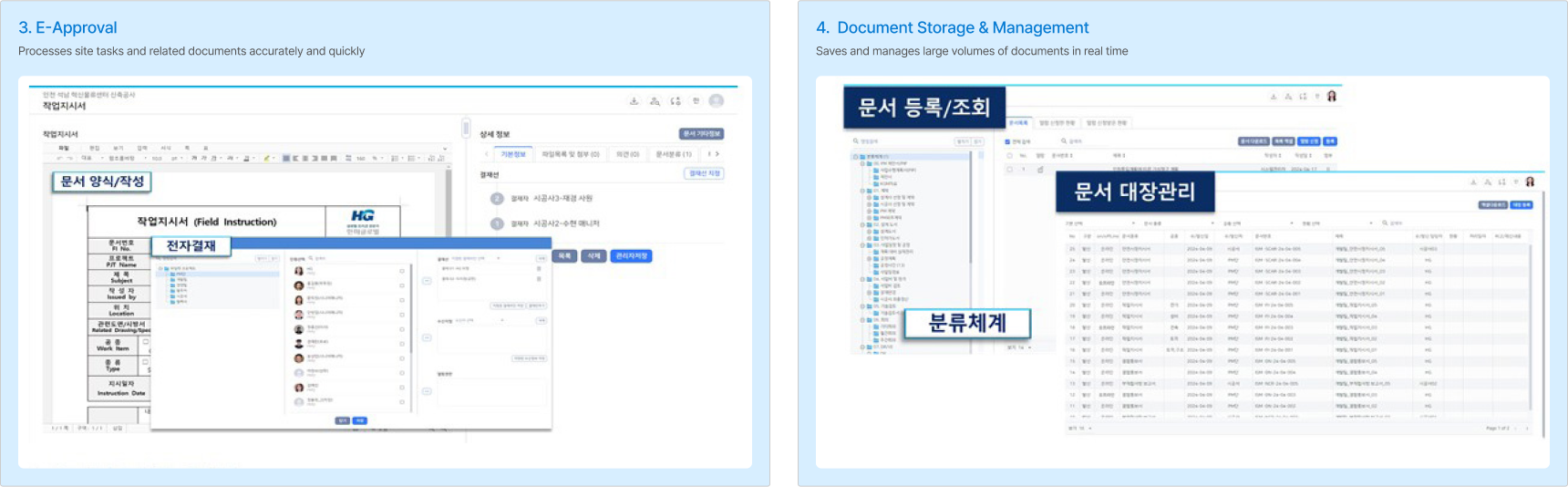 Designed around real on-site workflows, our platform provides a convenient and efficient one-stop system for creating, approving, storing, organizing, and searching documents.