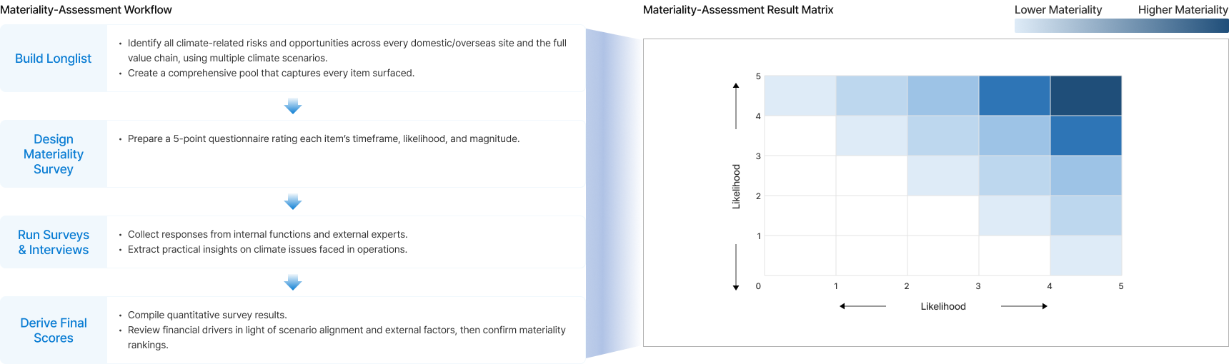 HanmiGlobal identifies climate risks and opportunities that could materially affect the business, quantifies their potential financial impact, and builds response plans. Guided by the TCFD recommendations, the company applies a step-by-step materiality procedure in which the relevant functions first surface transition/physical risks and opportunities, then are evaluated by internal and external experts to create the materiality pool. Each factor is scored quantitatively on its business impact, considering time horizon (Duration), impact size (Magnitude), and likelihood of occurrence (Likelihood). Stakeholder feedback from the responsible departments is incorporated to ensure the robustness and practical relevance of the results.