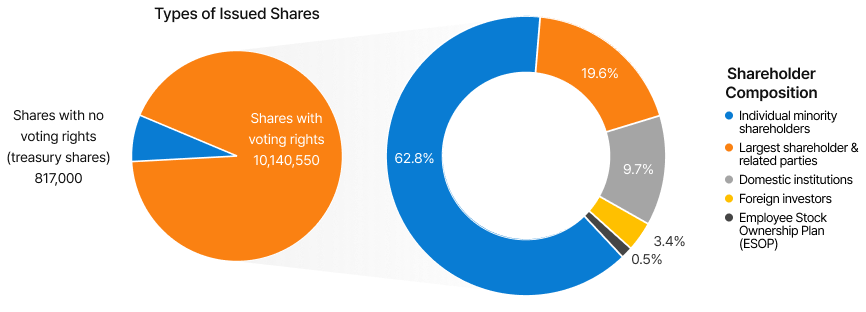 As of 31 December 2024, HanmiGlobal had 10,957,550 common shares issued, of which 10,140,550 carry voting rights. All shares are ordinary shares subject to a “one share, one vote” rule, ensuring equal rights for every shareholder. Holdings of the largest shareholder, related parties, and any owner of 5 % or more are disclosed in detail in the company’s annual report. In 2015, HanmiGlobal launched a company-wide Employee Stock Ownership Plan, which the Ministry of Labor has recognized as a best practice labor–management model; employees held 0.5 % of outstanding shares at year-end 2024. Minority shareholders who each own less than 1 % collectively account for 62.8 % of the total shares outstanding.