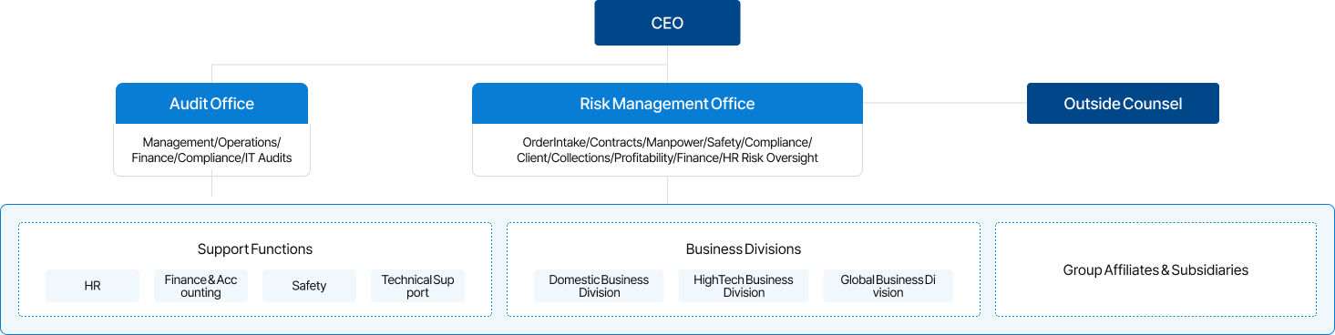 HanmiGlobal performs risk management at every operating tier, including project sites, business divisions, and corporate support functions. For each unit, priority risks are identified to reflect its specific characteristics and stakeholder relationships. The process covers a broad spectrum of risk factors, including environment, human rights and labor, health and safety, and ethics and compliance. After evaluating likelihood and impact, the company selects the key risks, devises mitigation plans, and monitors implementation on an ongoing basis.