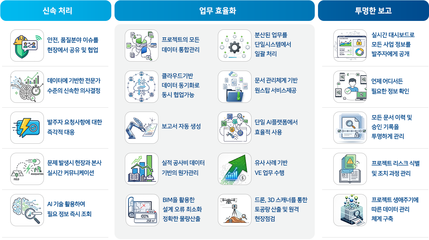 · 현장에서 업로드한 자료가 실시간 저장되고, 수정할 수 있어 업무 효율성 향상 · 문서 출력 기능을 통해 부가 작업을 최소화하여 업무 시간 절약 가능 -