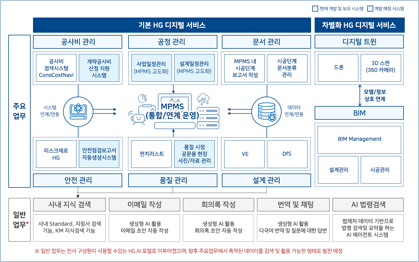 전사 AI 전환을 위해 AI & Digital 솔루션 적용 활성화 및 교육 활동을 수행하고 있습니다. 자체 개발 플랫폼 구성 모듈, 프로젝트 관리 업무 지원 프로그램 등에 대해 현장 방문과 온라인 교육을 통해 전달함으로써 실무에 적극 활용할 수 있도록 지원하고 있습니다.